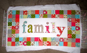I really loved how it turned out so I decided to do a brief tutorial on it! Her version was somewhat scrappy, but this time I opted to use a number of prints from the same collection (Farmdale) and some coordinates. The runner finishes at 18"x36" This would make a great housewarming or wedding present since you can personalize what you say in the middle--I love the idea of putting a newly married couple's last name on it!